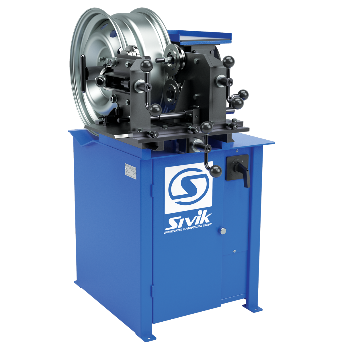 Стенд предназначен для реставрации деформированных закраин и полок ободьев колёс легковых автомобилей.