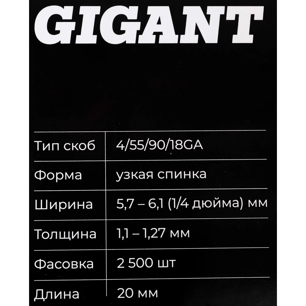 Скобы 18GA для пневматического степлера 20 мм, 2500 шт./уп Gigant GSPS-15 применяются при сборке каркасов, контейнеров, деревянной мебели, креплении облицовочных материалов к поверхностям из фанеры, дерева, ДСП, с помощью степлера электрического или пневматического. Скобы изготовлены из закаленной оцинкованной проволоки, защищены от коррозии. Имеют высокую пробивную способность. Обеспечивают надежное и долговечное крепление.
