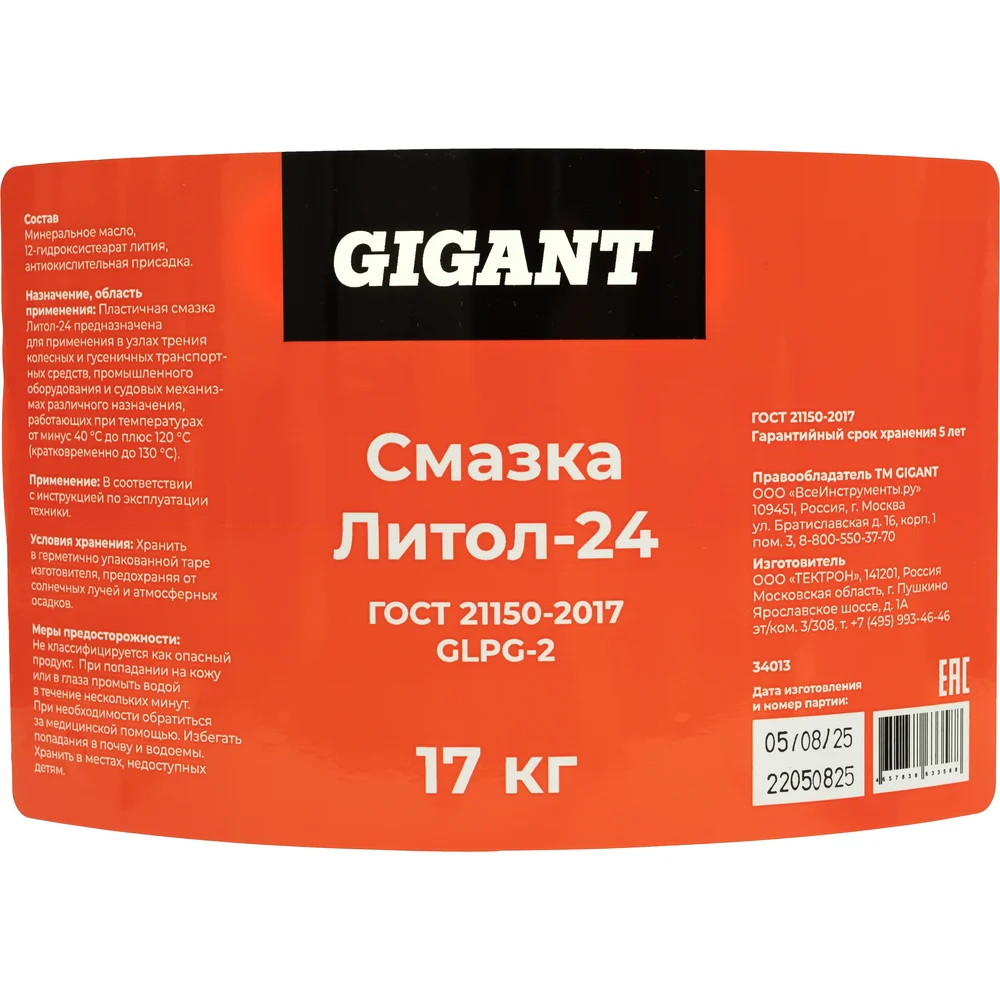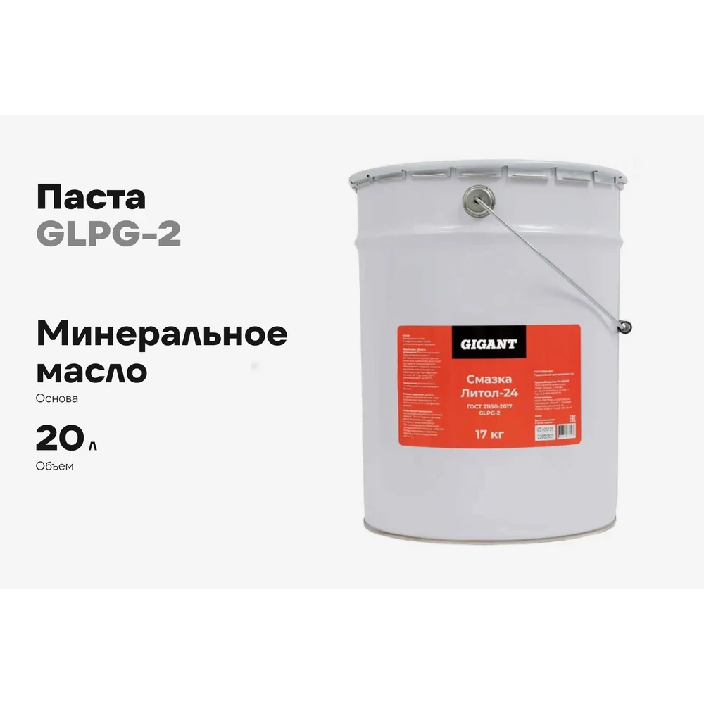 Смазка литол-24 Gigant бочка 20л. GLPG-2 используется для обработки подшипников качения и скольжения всех типов, шарниров, зубчатых и других передачах; поверхностей трения колесных и гусеничных транспортных средств, а также индустриальных механизмов, электрических машинах и т.п. В состав смазки входит базовое минеральное масло, литиевое мыло и высокоэффективный пакет присадок. Присадки обеспечивают коллоидную, химическую и механическую стабильность устойчивость к воде работоспособность при температуре от -40 до +120 °С защиту деталей от износа стойкую пленку
