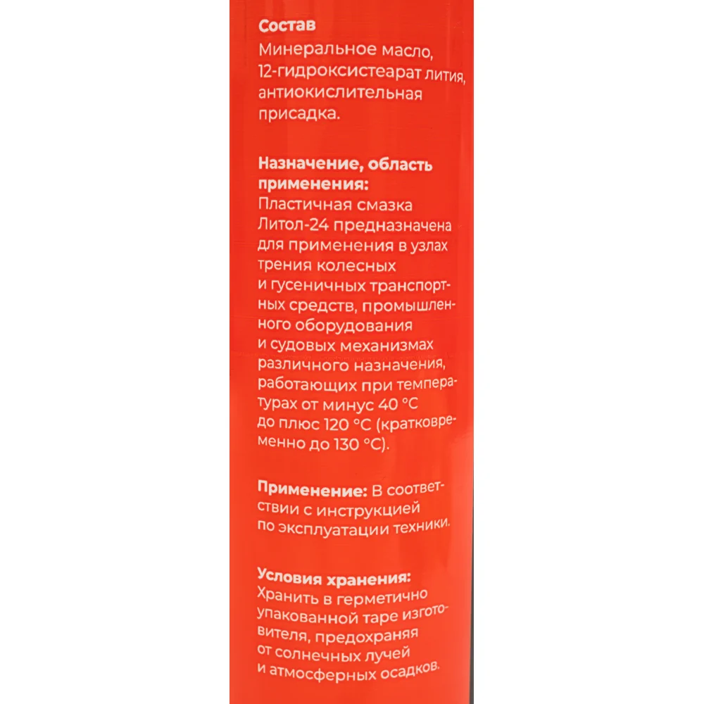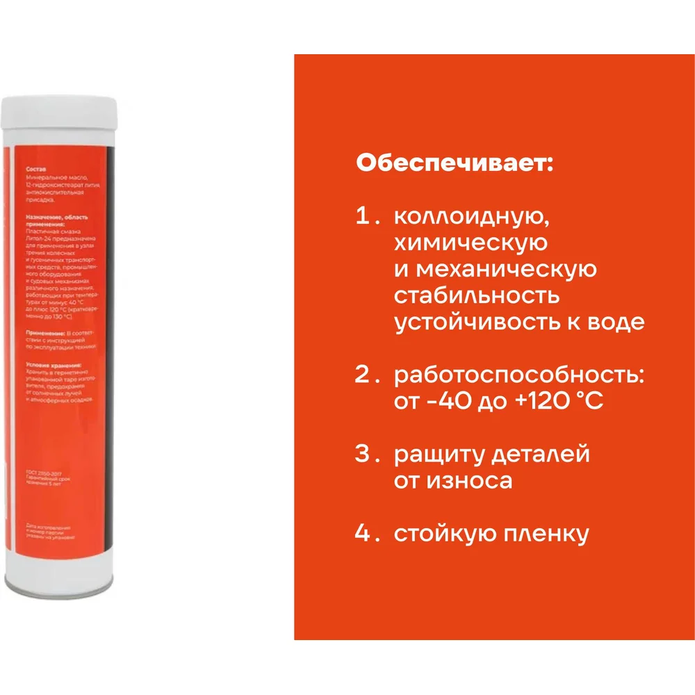 Смазка литол-24 туба 400 г., Gigant GLPG-4 используется для обработки подшипников качения и скольжения всех типов, шарниров, зубчатых и других передачах; поверхностей трения колесных и гусеничных транспортных средств, а также индустриальных механизмов, электрических машинах и т.п. В состав смазки входит базовое минеральное масло, литиевое мыло и высокоэффективный пакет присадок. Присадки обеспечивают коллоидную, химическую и механическую стабильность устойчивость к воде работоспособность при температуре от -40 до +120 °С защиту деталей от износа стойкую пленку