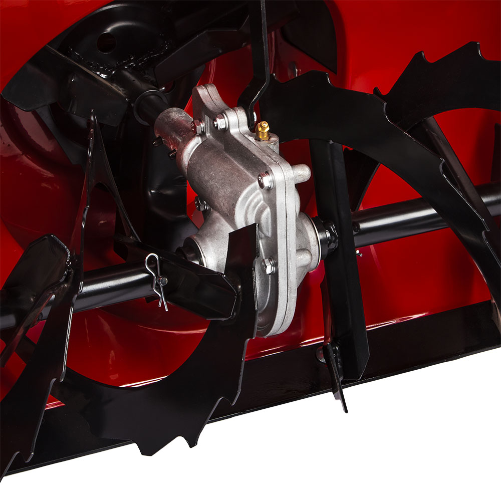 Снегоуборщик оснащен металлическим шнеком с зубцами, который эффективно перемалывает снег.