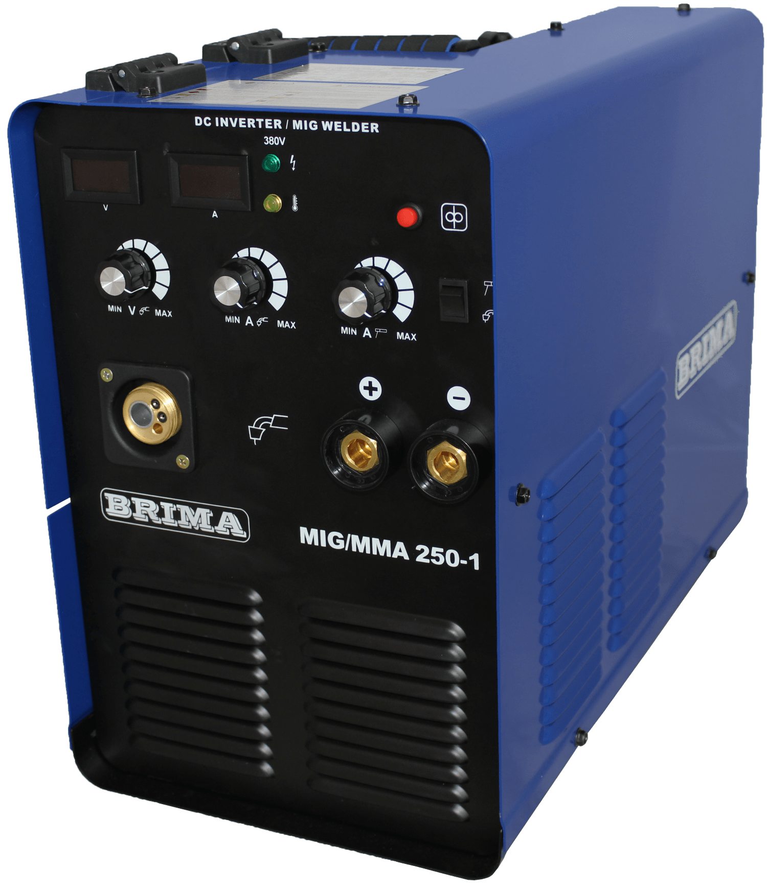 - Сварочный ток и напряжение аппарата MIG/ММА-250-1 BRIMA можно настраивать с помощью регуляторов (потенциометров) на панели управления. Регуляторы с четкой шкалой и понятным символьным обозначением.