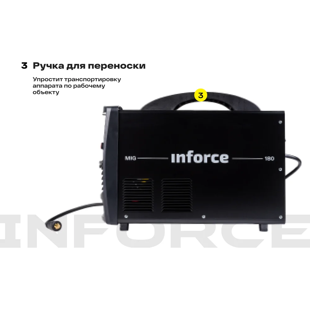 Сварочный полуавтомат-инвертор Inforce MIG-180 04-08-02 предназначен для профессионального использования. Подходит для ежедневных интенсивных работ. Широкая ручка позволяет легко поднимать и переносить аппарат одной рукой. Многочисленные отверстия на корпусе обеспечивают эффективное охлаждение и предотвращают перегревание аппарата во время работы. Аппарат работает с цветной, стальной, порошковой проволокой в среде защитного или инертного газа, также может работать с самозащитной порошковой проволокой без газа. Полуавтомат хорошо справляются с работой на максимальных токах, а значит будет полезен на производстве, в автосервисе или в быту. Простота управления позволит разобраться с аппаратом даже начинающему сварщику. Скорость подачи проволоки от 2,5 до 13 м/мин. Размер подающего ролика - 30х10х10 мм.