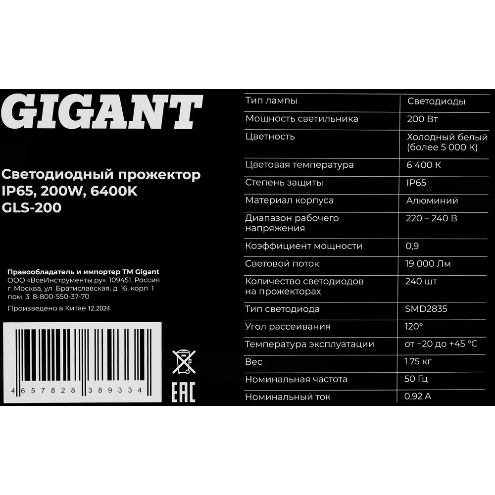 Светодиодный прожектор IP65 200W 6400K Gigant GLS-200 - пылевлагозащищенный световой аппарат для коммерческого и промышленного использования. Корпус изделия устойчив к ударам и не боится больших перепадов температур. Прожектор данной модели станет прекрасной альтернативой устаревшим металлогалогенным прожекторам. Предназначен для решения широкого спектра задач по освещению открытых пространств, архитектурных объектов, торговых площадей, подсветки парковок, рекламных конструкций, экспозиций и ландшафта. Тип и количество светодиодов: 240 светодиодов SMD2835. Угол рассеивания:120°. Температура эксплуатации: от -40 до +45°C. Степень защиты IP65 позволяет использовать прожектор как внутри, так и на улице. Корпус из литого под давлением алюминия с каленым стеклом. Цветовая температура - 6400К.