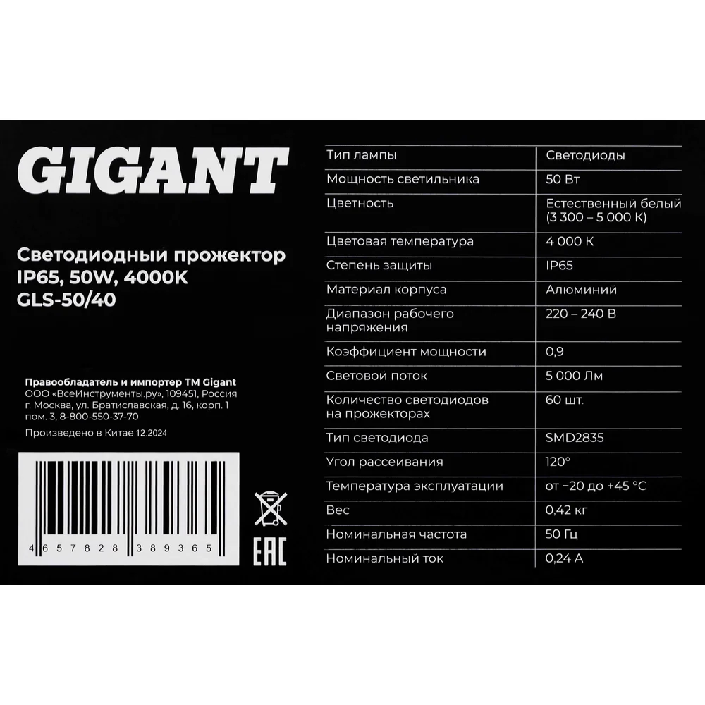 Светодиодный прожектор IP65 50W 4000K Gigant GLS-50/40 - высокопрочный, надежный, долговечный, пылевлагозащищенный осветительный прибор, который станет прекрасной альтернативой устаревшим моделям галогенных прожекторов. Изделие подходит для освещения различных уличных объектов и зимой, и летом. Тип и количество светодиодов: 60 светодиодов SMD2835. Угол рассеивания:120°. Температура эксплуатации: от -40 до +40°C. Степень защиты IP65 позволяет использовать прожектор как внутри, так и на улице. Корпус из литого под давлением алюминия с каленым стеклом. Цветовая температура - 4000К.