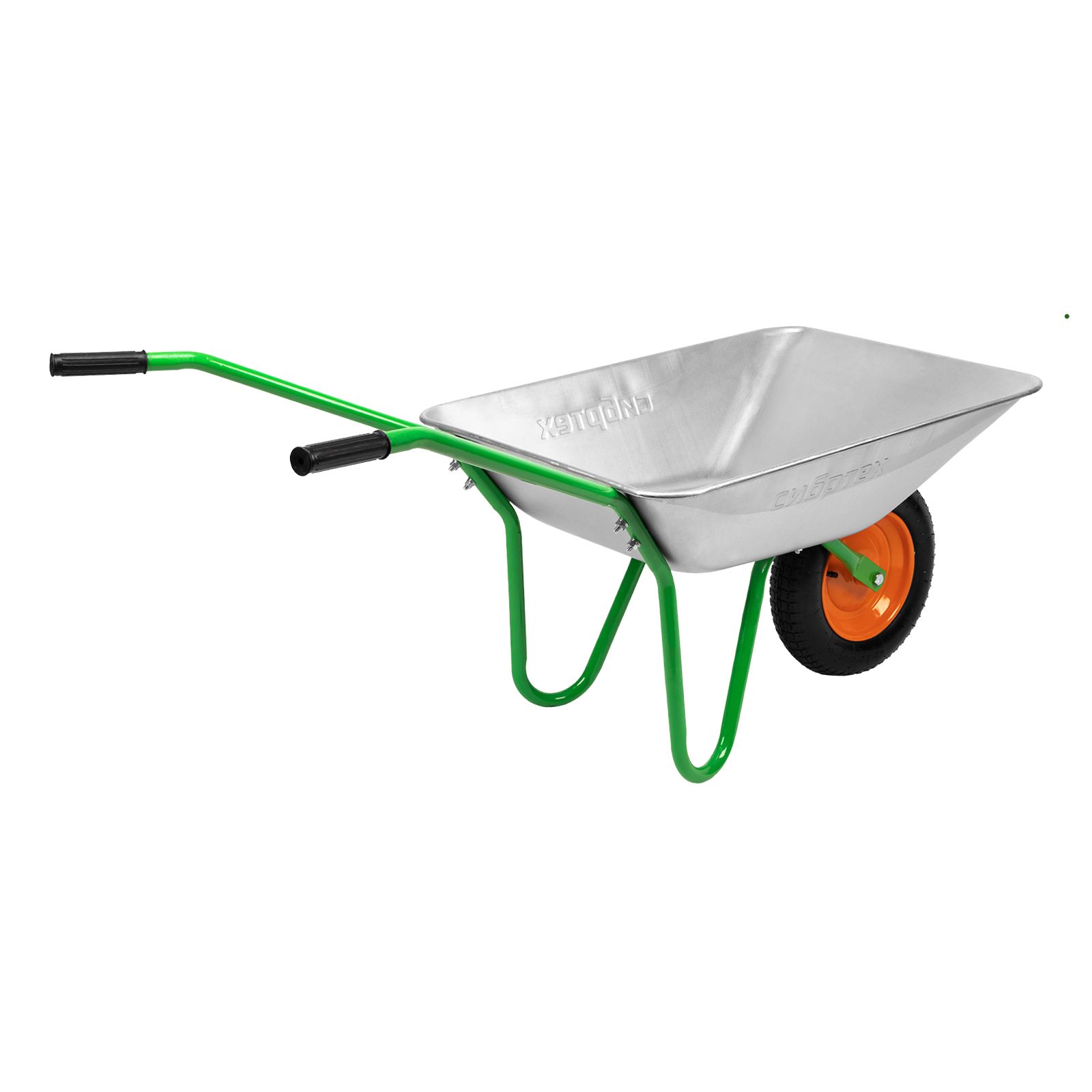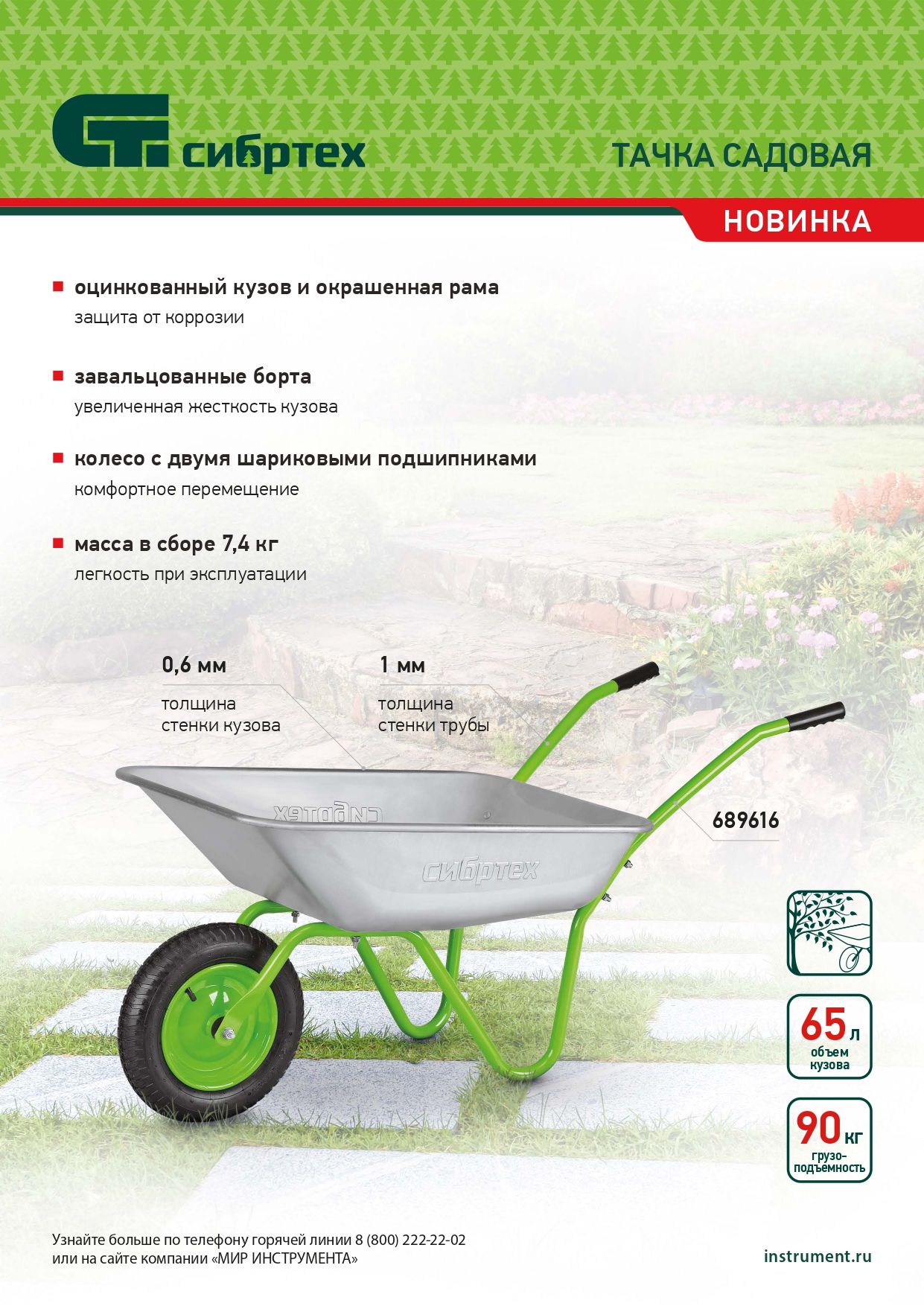 Садовая тачка Сибртех 689616 грузоподъемностью 90 кг, с кузовом объемом 65 л, используется для проведения работ на загородном участке. Рама изготовлена из трубы диаметром 25 мм с толщиной стенок 1 мм, что обеспечивает оптимальный баланс грузоподъемности и веса изделия. Тачка удобна для перемещения веток, листвы, мусора во время уборки в саду и огороде.
