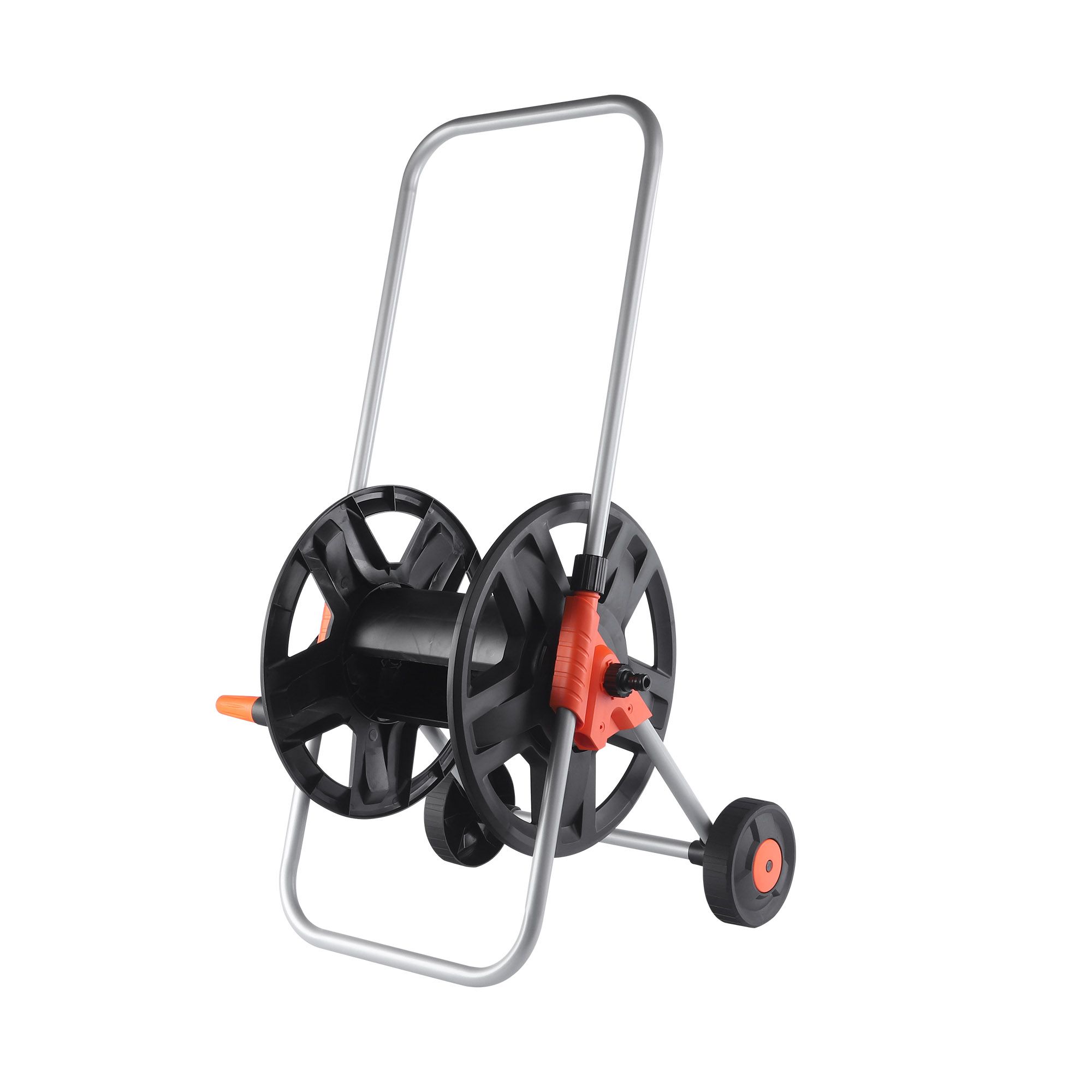 Тележка на колесах предназначена для компактного хранения и транспортировки садового шланга к месту полива на небольших по площади садовых участках.