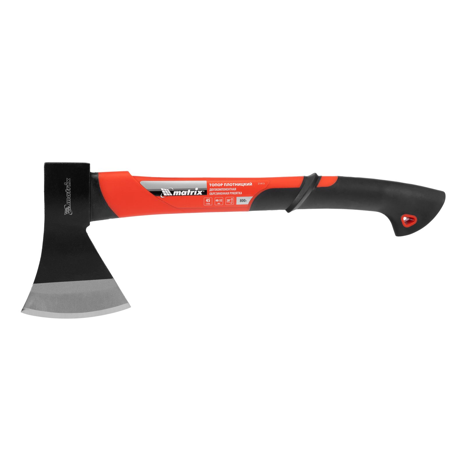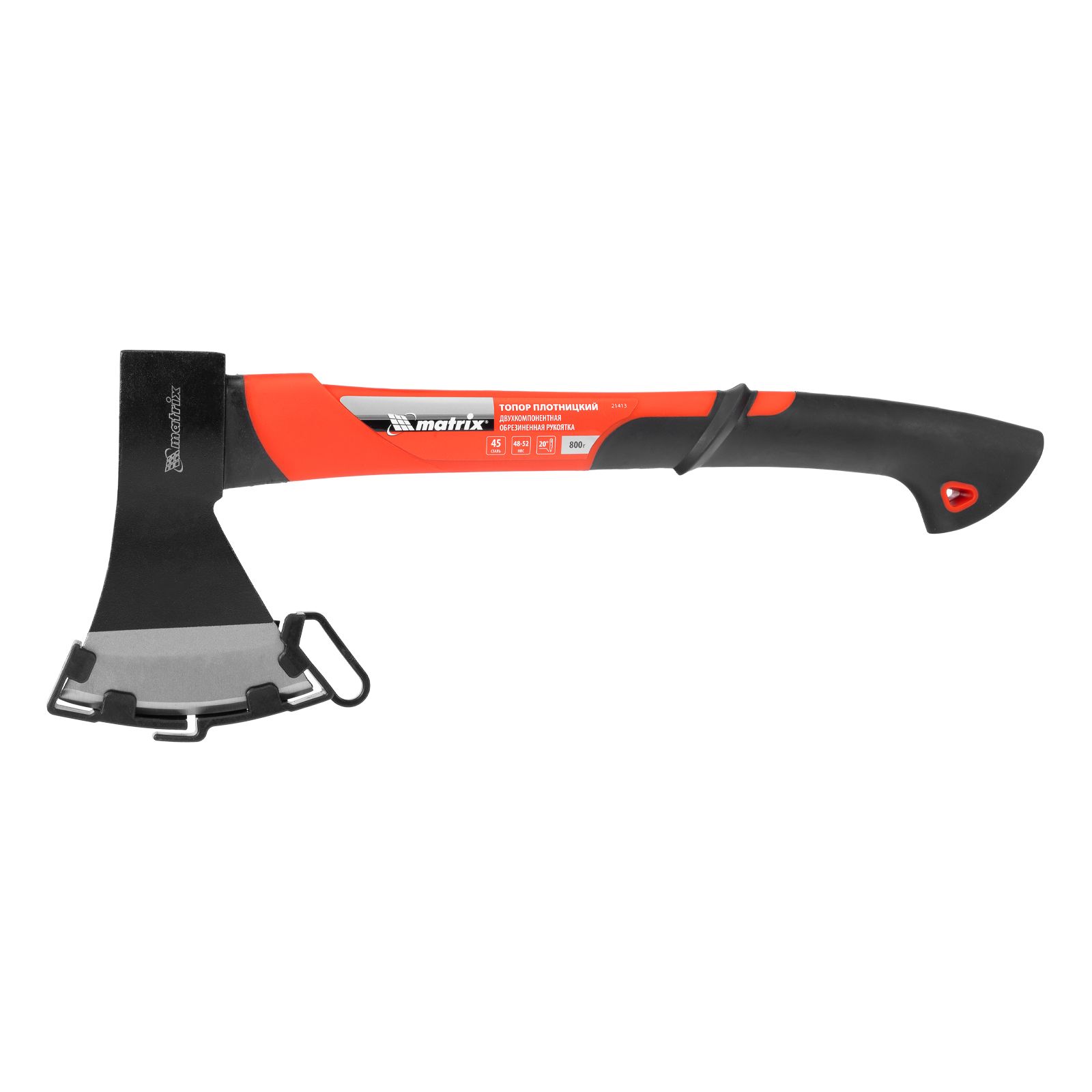 Топор Matrix 21413 длиной 450 мм, с рабочей частью весом 800 г и эргономичной фибергласовой рукояткой, используется для колки дров, заострения колышков, вырубки кустов, рубки сучьев, а также выполнения других работ. Полукруглое лезвие в сочетании с оптимальным соотношением длины и веса упрощает работу. Инструмент используется для решения бытовых задач.