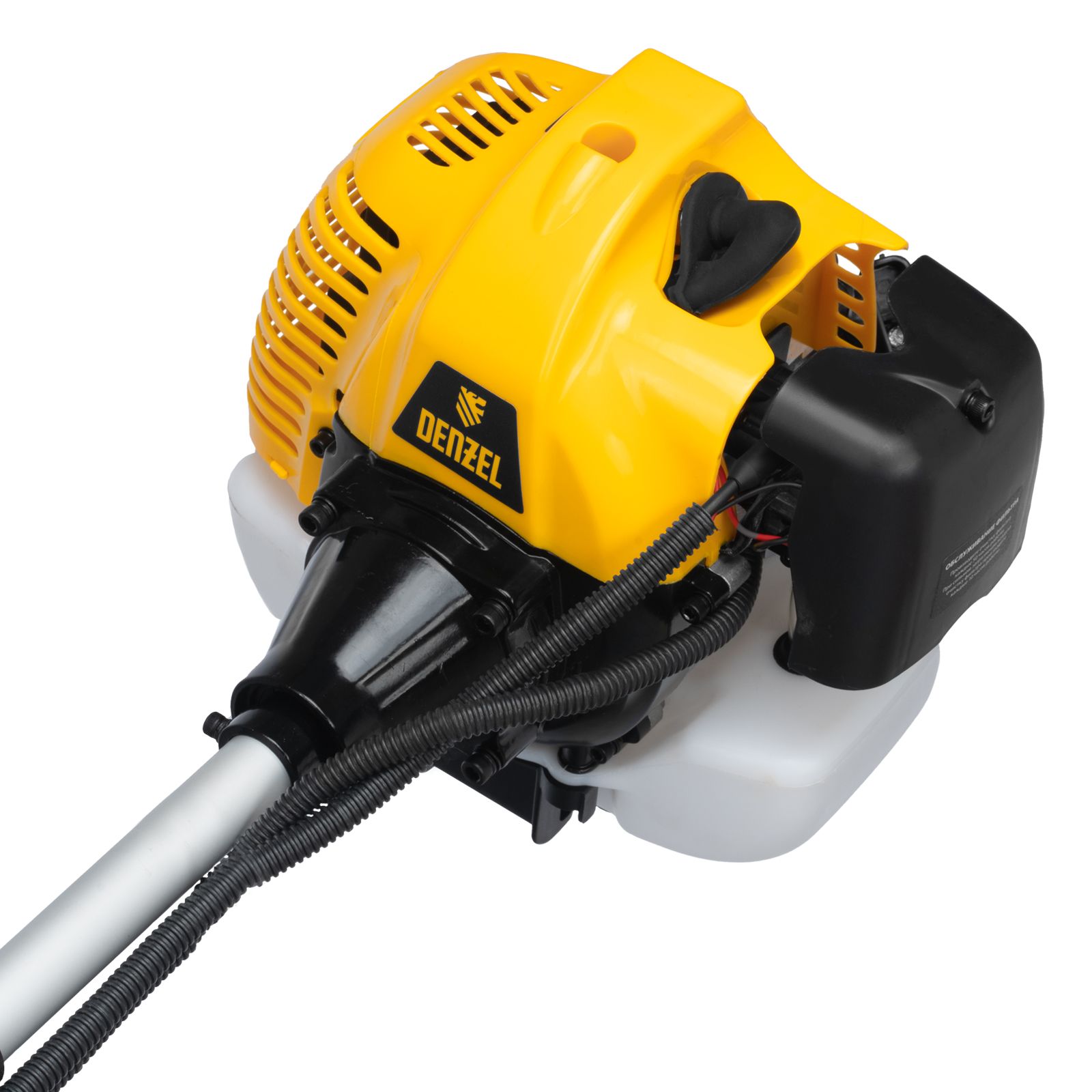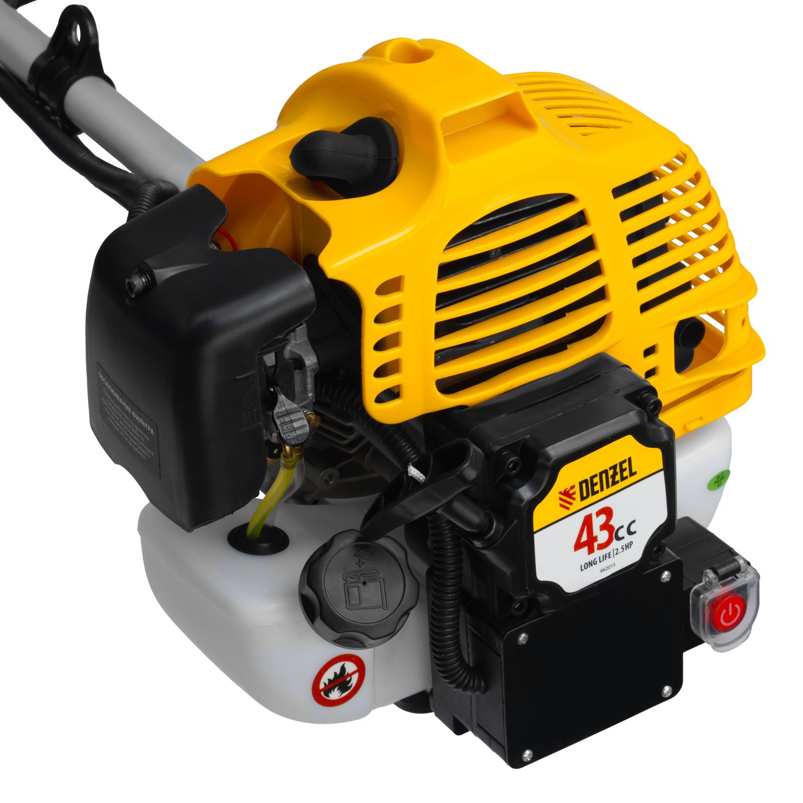 Бензиновый триммер Denzel DT-43E 962015 с двигателем объемом 43 куб. см, с неразъемной штангой и электростартером, поставляется комплектом из 2 частей и используется для ухода за дачным участком. С его помощью можно подравнять газон, скосить траву любого типа, в том числе с жесткими древовидными стеблями (полынь, крапива, лебеда, борщевик), а также срезать кустарник и молодые побеги деревьев с диаметром стволов до 10 мм. Триммер успешно справляется с этими задачами благодаря входящим в комплект катушке с леской и пильному диску с шириной скашивания 42 и 25,5 см соответственно. На штангу уже установлен редуктор и корпус сцепления, что упрощает подготовку инструмента к работе.