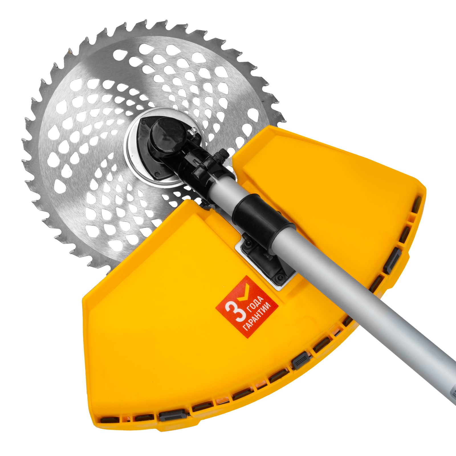 - Дополнительные возможности — можно приобрести и установить на триммер диски Denzel 96323, 96325 для быстрого удаления растительности с жесткими стеблями (полыни, крапивы, лебеды), 96328 для скашивания молодых побегов кустарника диаметром до 3 мм.