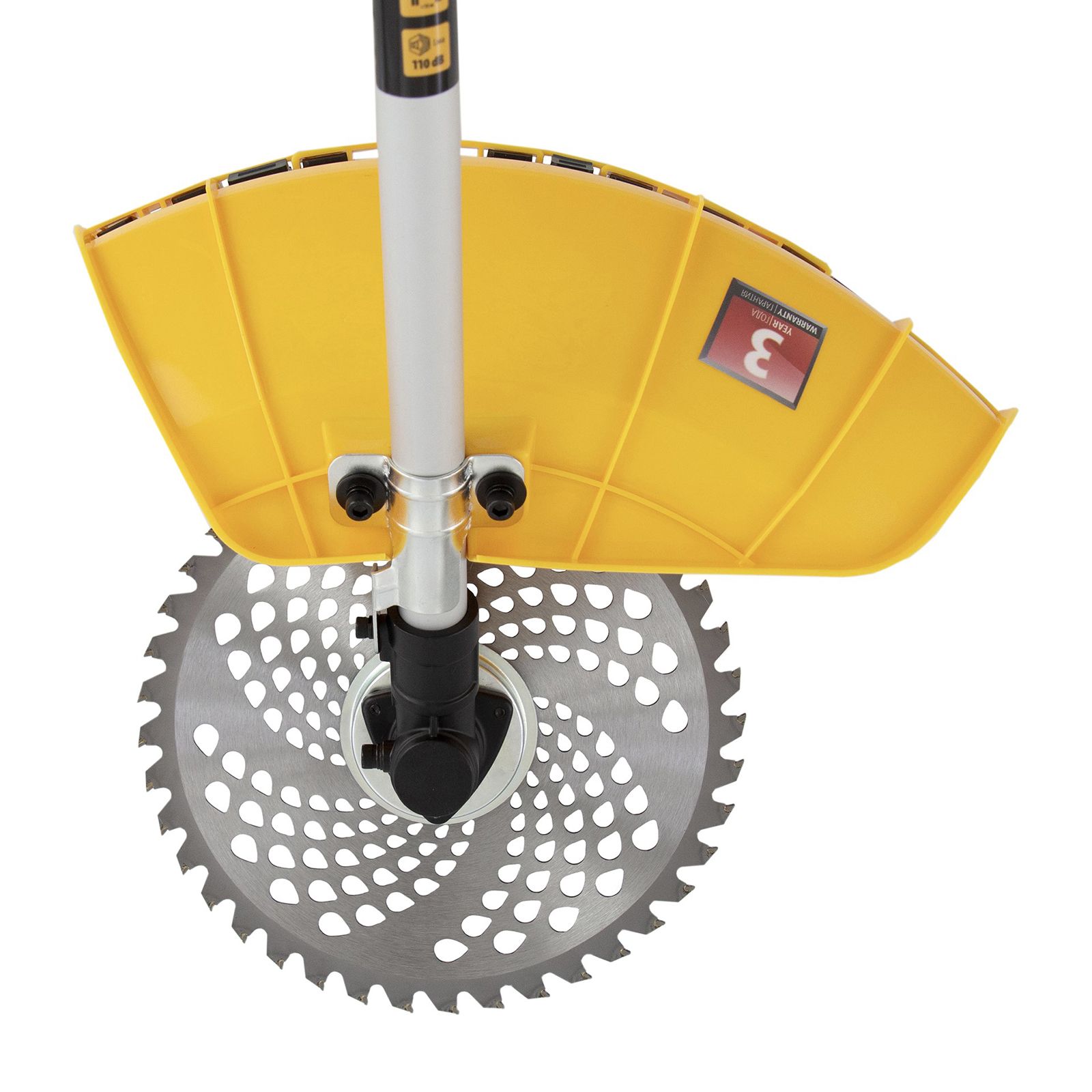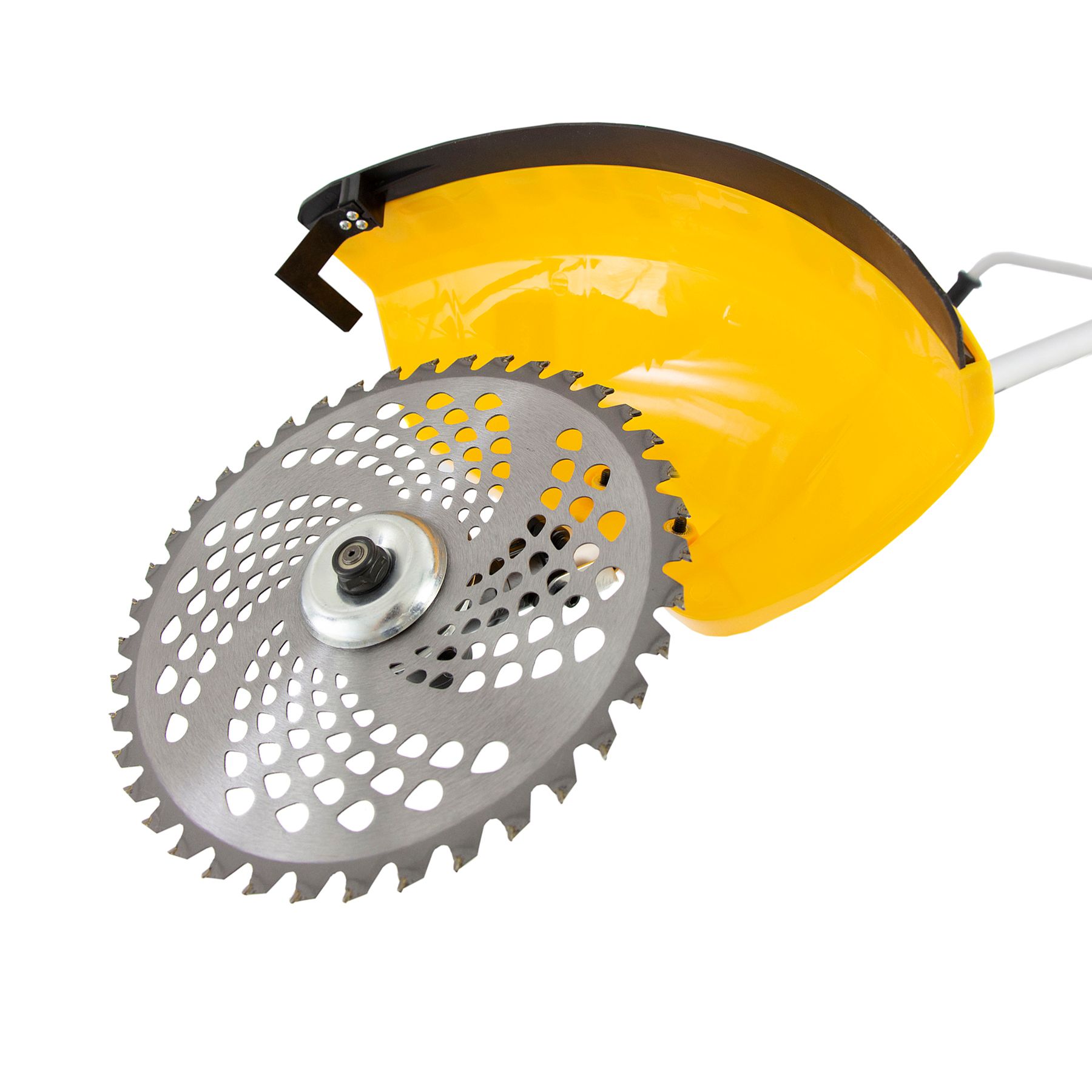 - Безопасная работа — защитный кожух закрывает режущую часть, поэтому в сторону пользователя не отлетают ветки и камни.