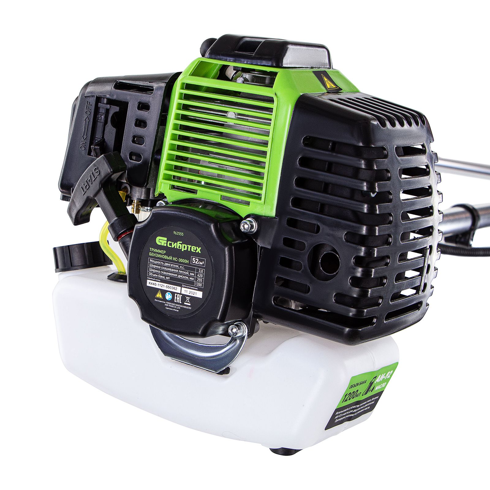 Бензиновый триммер Сибртех КС-3000Н 962555 с неразъемной штангой имеет двигатель увеличенного объема 52 куб. см, поставляется комплектом из 2 частей и предназначен для ухода за дачным участком. Используется для стрижки и скашивания травы, обработки границ газонов и борьбы с сорняками. Для эффективного решения этих задач предусмотрены катушка с леской и трехлопастный нож, легко срезающий густую траву и толстые стебли. Ширина скашивания леской составляет 42 см, ножом — 25,5 см, что в сочетании с мощностью двигателя 3 л. с. обеспечивает высокую производительность триммера.