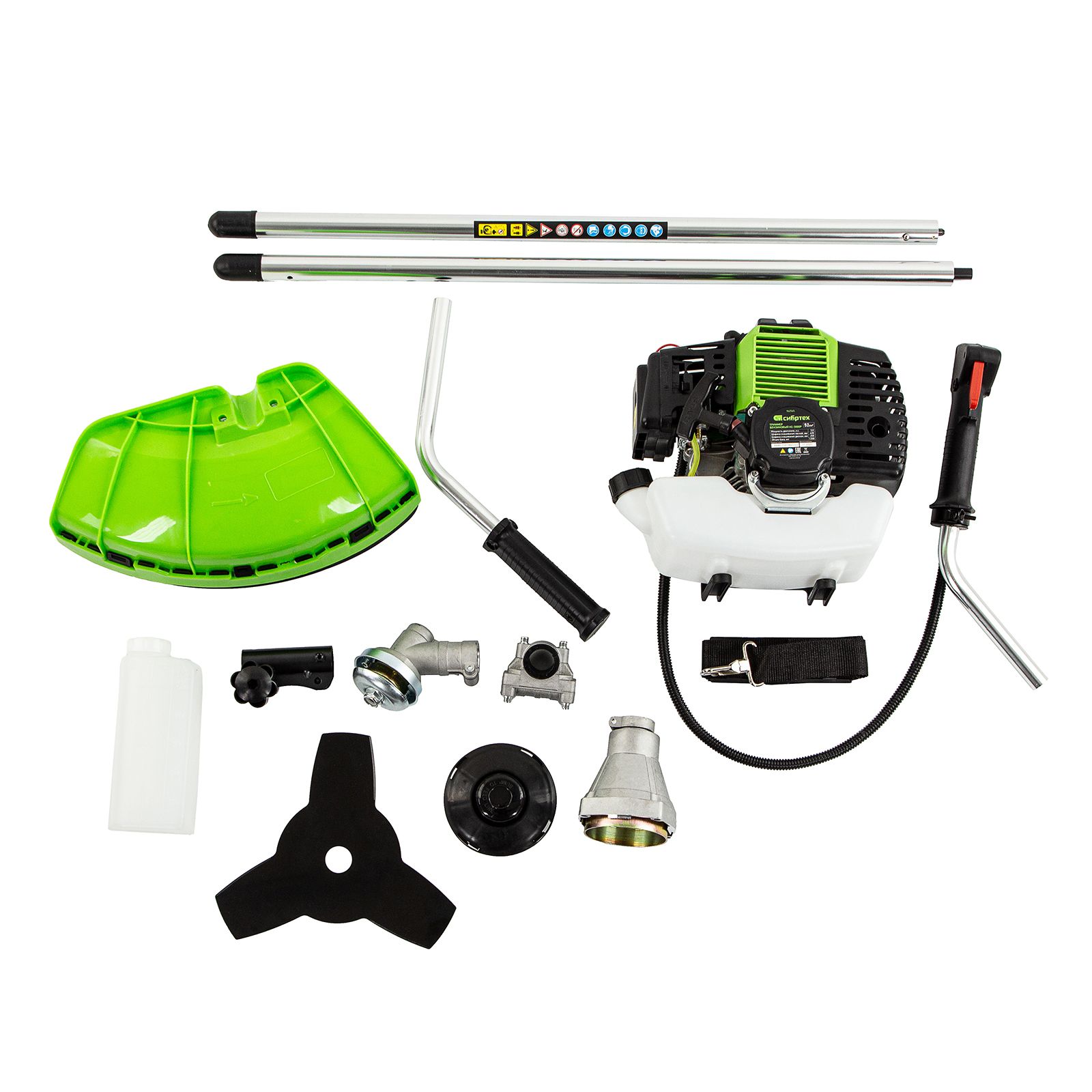 Бензиновый триммер Сибртех КС-3000Р 962565 с разъемной штангой, поставляющийся комплектом из 2 частей, имеет двигатель объемом 52 куб. см и мощностью 3 л. с., благодаря чему успешно справляется с подравниванием газона, скашиванием травы на лужайке и уничтожением сорняков. Выполнение этих задач облегчают режущие элементы — катушка с леской и трехлопастный нож. Леской триммер скашивает 42 см за один проход, а ножом — 25,5 см, поэтому можно за короткое время привести дачный участок в порядок. Благодаря разборной штанге мотокоса не занимает много места во время хранения и транспортировки.