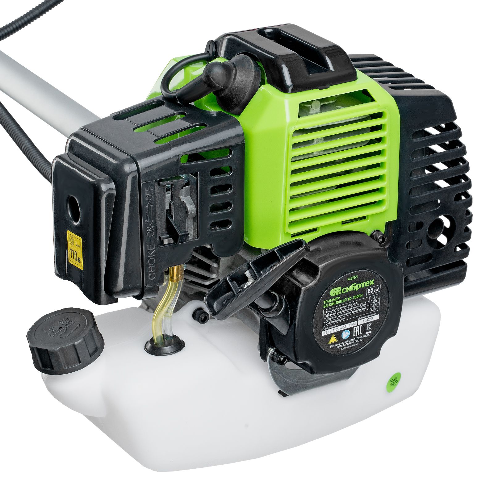 Триммер бензиновый Сибртех ТС-3000Н 962255 с двигателем объемом 52 см3 и неразъемной штангой поставляется комплектом, состоящим из 2 частей. Используется для стрижки газонной травы и скашивания растительности. Входящий в комплект поставки трехлопастный нож позволяет легко справляться с густой, жесткой травой и толстыми стеблями сорняков. Оснастка вращается с частотой 9500 об/мин, ширина скашивания леской составляет 420 мм, ножом — 255 мм. Двигатель мощностью 3 л.с. обеспечивает высокую производительность инструмента и позволяет быстро справиться с работой.