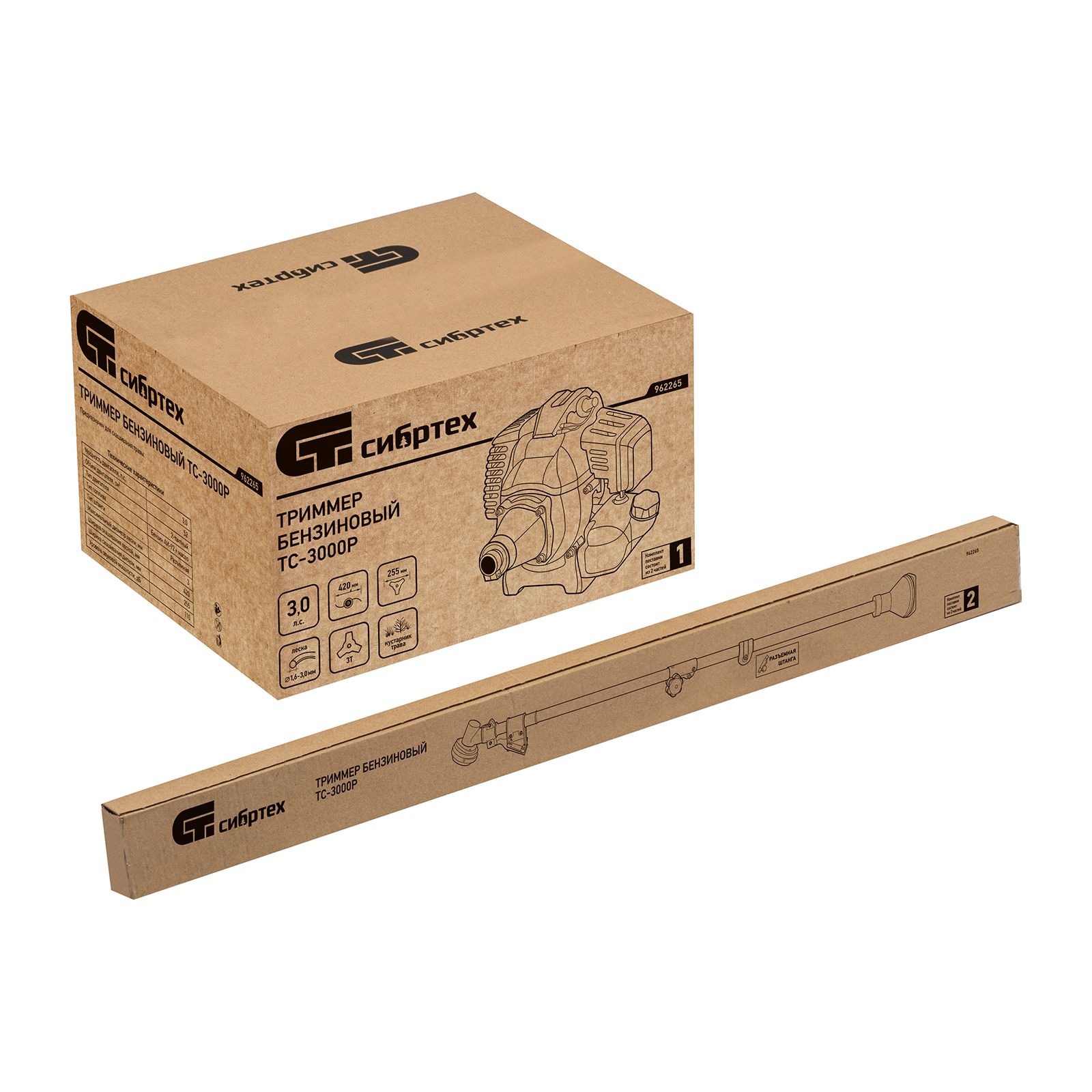 Триммер бензиновый Сибртех ТС-3000Р 962265 с двигателем объемом 52 см3 и разъемной штангой поставляется комплектом, состоящим из 2 частей. Используется для стрижки газонной травы и скашивания растительности. Входящий в комплект поставки трехлопастный нож позволяет легко справляться с густой, жесткой травой и толстыми стеблями сорняков. Оснастка вращается с частотой 9500 об/мин, ширина скашивания леской составляет 420 мм, ножом — 255 мм. Двигатель мощностью 3 л.с. обеспечивает высокую производительность инструмента и позволяет быстро справиться с работой.