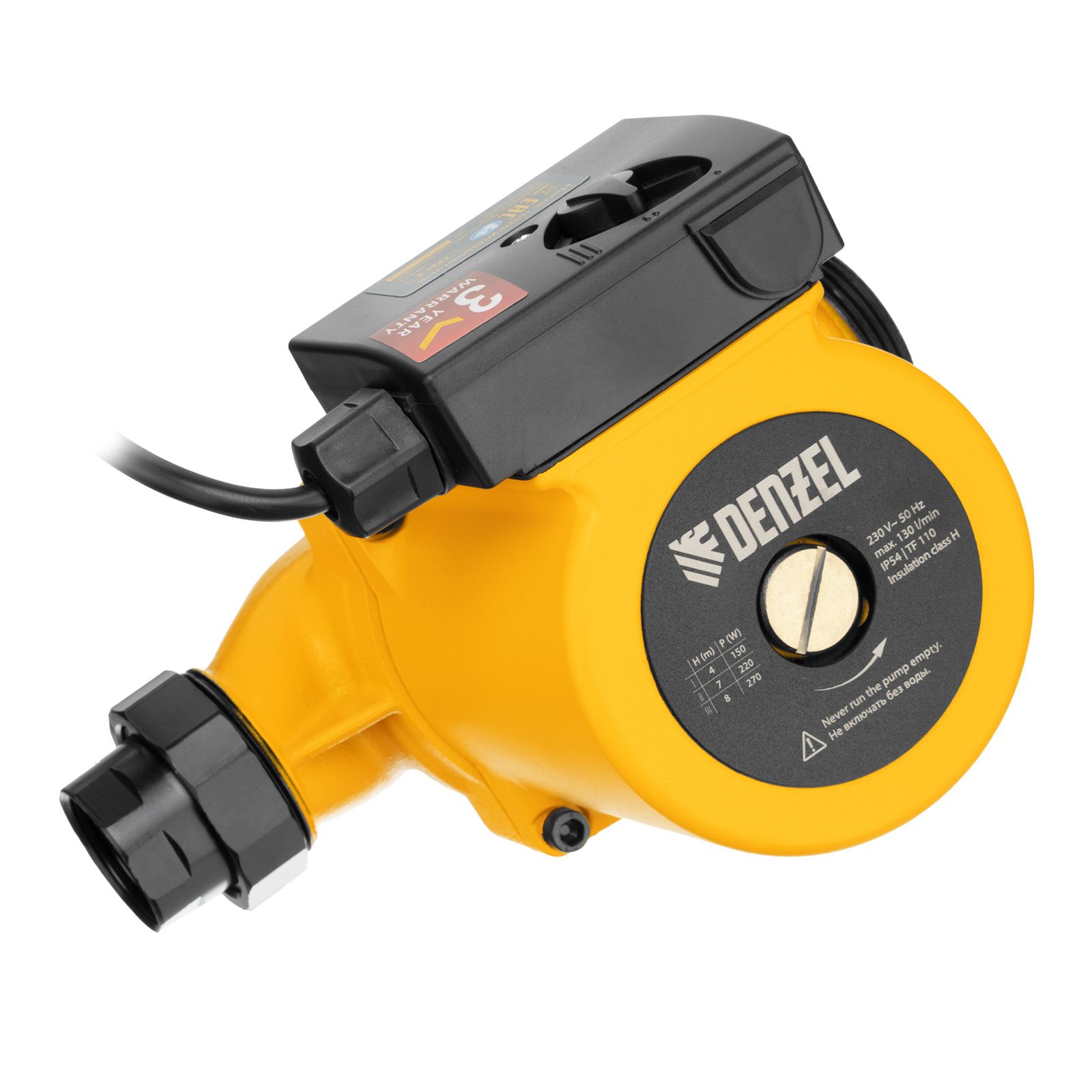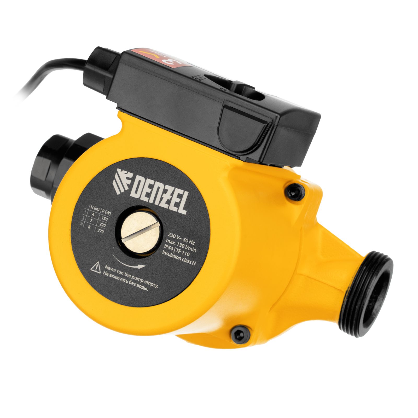 Циркуляционный насос Denzel CP25-8 99412 с кабелем длиной 1 м имеет монтажную длину 180 мм и обеспечивает напор до 8 м, максимальный объем перекачиваемой жидкости составляет 130 л/мин. Устройство обеспечивает непрерывное движение горячей воды температурой до 110 °C по трубопроводу. Насос позволит организовать эффективную систему теплоснабжения загородного дома.