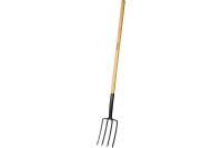 Рабочая часть вил имеет четыре заостренных зубца, выполненных из углеродистой стали, что обеспечивает их прочность и устойчивость к износу. Защитное покрытие из порошковой краски увеличивает срок службы инструмента, защищая его от коррозии. Деревянный черенок имеет прочную конструкцию и завершен лаковой отделкой, что делает его комфортным для держания и использования.