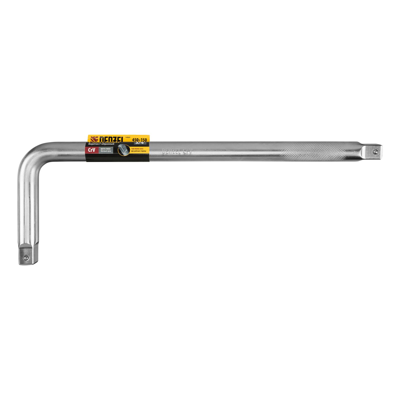 Г-образный вороток Denzel 14069 из стали CrV, размером 450 х 150 мм, с присоединительным квадратом 3/4", с покрытием «матовый хром», предназначен для ручного монтажа и демонтажа гаек, болтов и другого резьбового крепежа с помощью торцевых головок. Может использоваться в бытовой и профессиональной сфере: для ремонта велосипедов, автомобилей, станков.