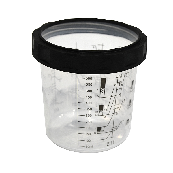 На мерной ёмкости предусмотрены шкалы для точного смешивания материалов в объёмных пропорциях 2:1, 3:1, 4:1, 5:1, 6:1, 7:1, а также общая градуировка. В отличие от продукции многих конкурентов, объём отмеренных материалов идеально соответствует нанесённой градуировке, что существенно повышает точность работы.