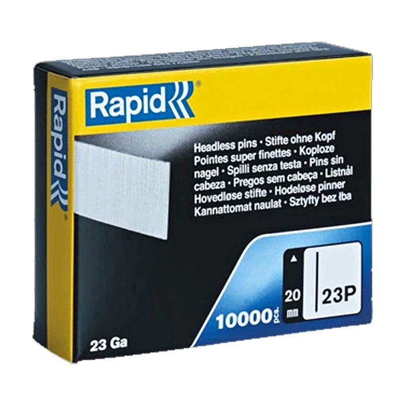 Закаленные супертвердые гвозди RAPID тип 23Р длиной 20 мм упаковкой по 1000 штук изготавливаются из высококачественной тонкой оцинкованной стали, что обеспечивает им надежность и долговечность. Эти микроштыри, не имея головки, позволяют достигать максимально аккуратного и незаметного соединения, что крайне важно при выполнении отделочных работ.
