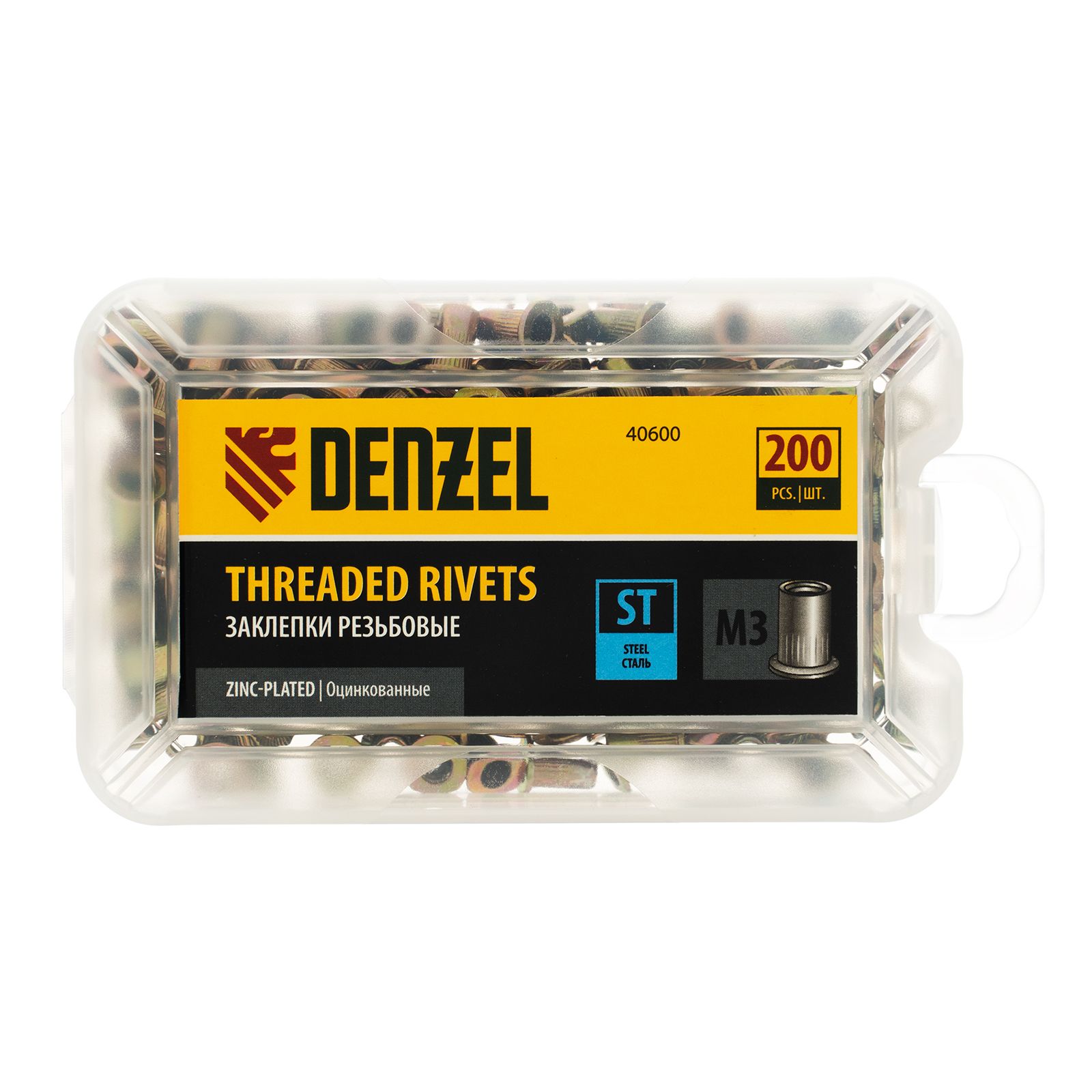 Стальные резьбовые заклепки Denzel 40600, с резьбой M3, оцинкованные, предназначены для скрепления листовых материалов толщиной 0,5-1,5 мм. Совместимы с заклепочником Denzel 40501. Позволяют получить резьбовое соединение даже при одностороннем доступе к месту крепления. Крепежные элементы используются для проведения строительных и монтажных работ, пригодятся на даче и в гараже.