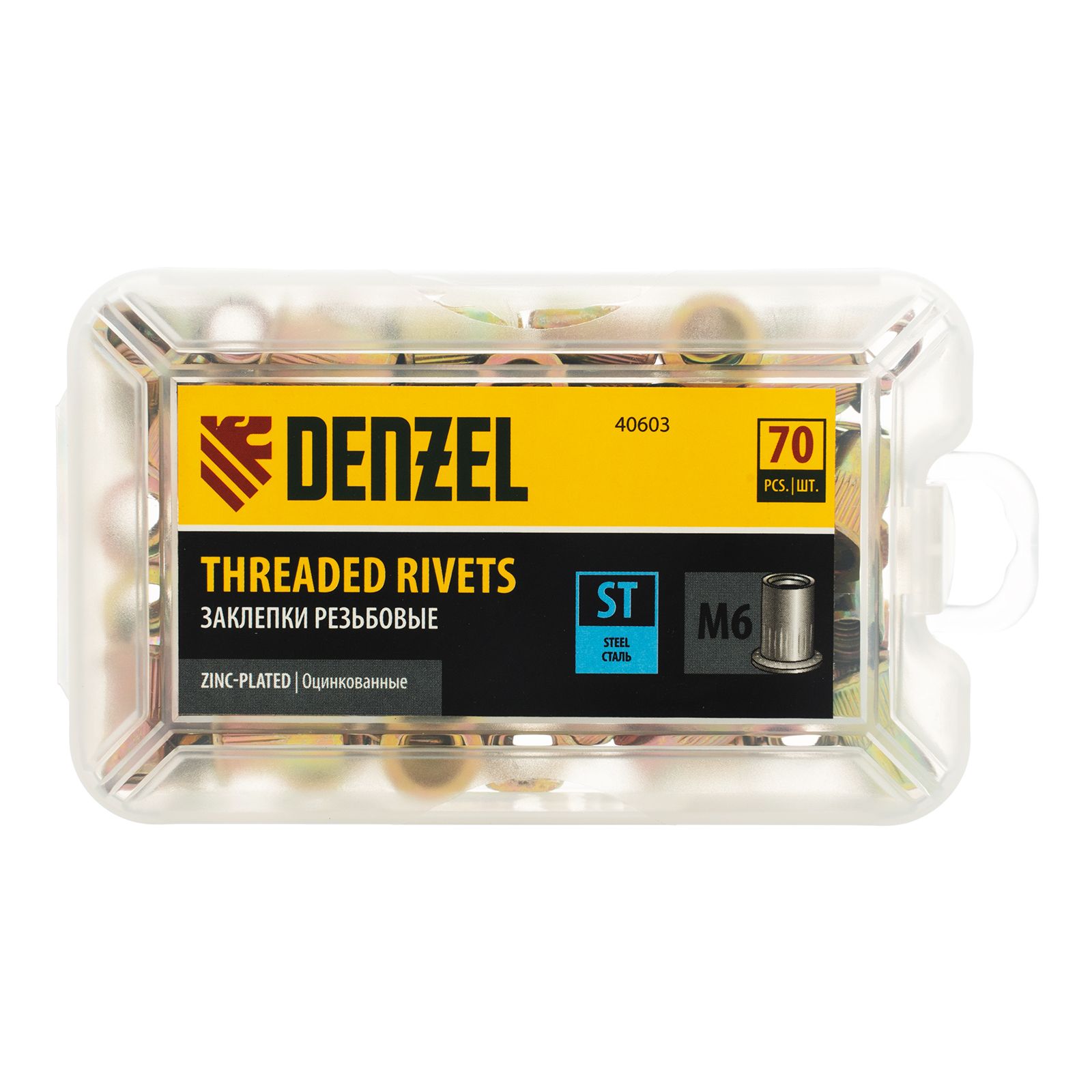Стальные резьбовые заклепки Denzel 40603, с резьбой M6, оцинкованные, предназначены для скрепления листовых материалов толщиной 0,5-3 мм. Совместимы с заклепочником Denzel 40501. Позволяют получить резьбовое соединение даже при одностороннем доступе к месту крепления. Крепежные элементы используются для проведения строительных и монтажных работ, пригодятся на даче и в гараже.