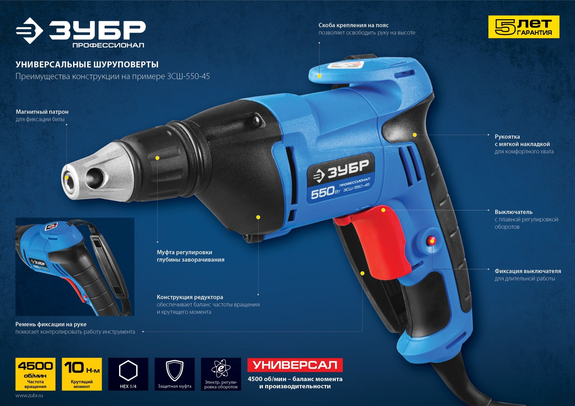 - Плавная регулировка глубины заворачивания для работы с различным крепежом и материалами