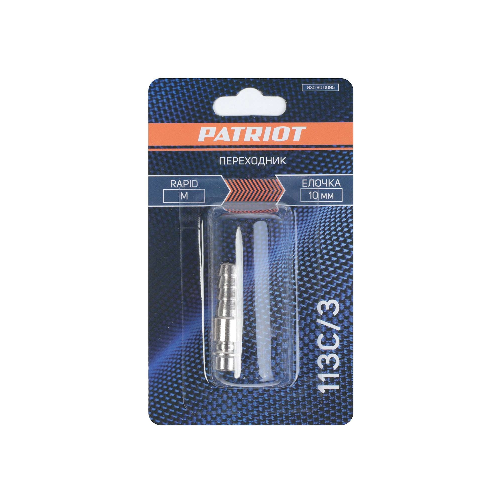 Быстросъёмный переходник PATRIOT 113С/3 для присоединения шланга к пневмоинструменту, компрессору или пневмолинии. Переход рапид - «елочка» 10 мм. Монтаж осуществляется с помощью хомута.