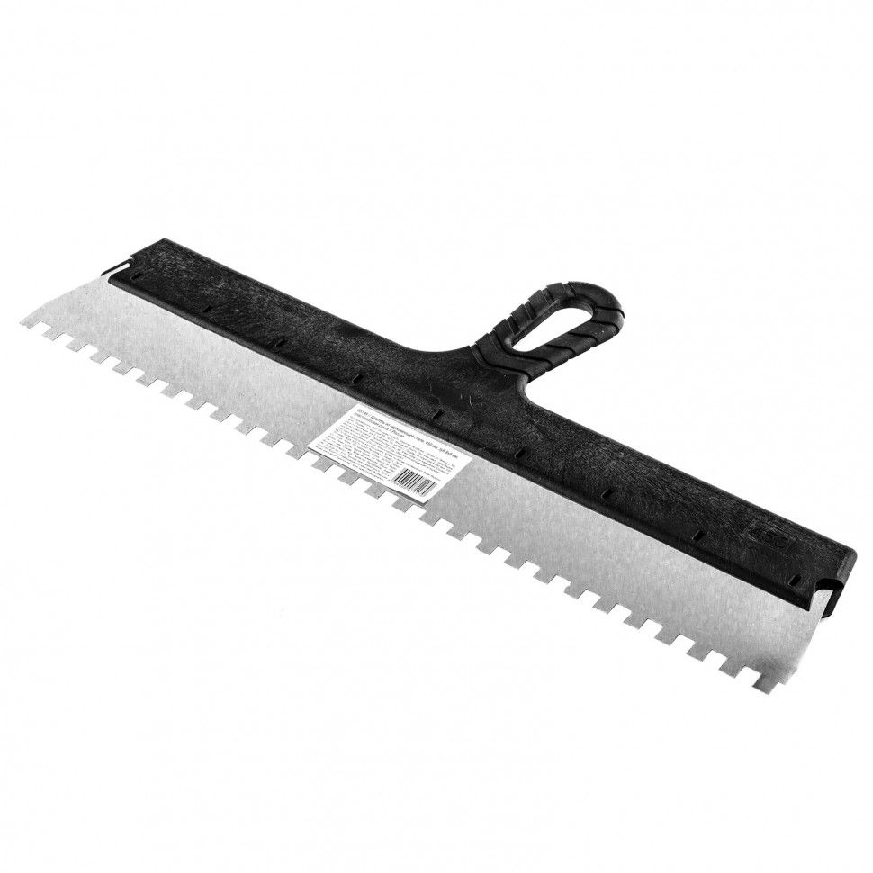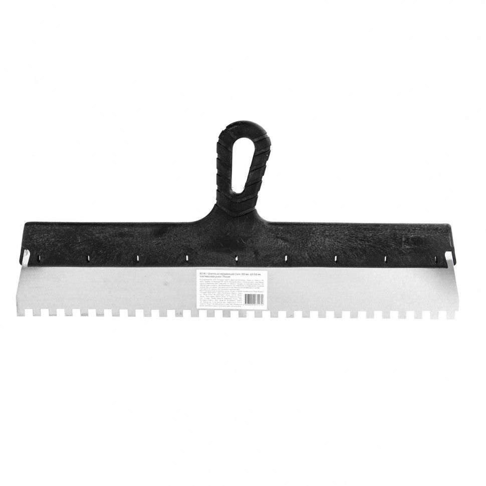 Шпатель Sparta 85146 из нержавеющей стали, шириной 450 мм, с пластмассовой рукояткой и зубьями 8 х 8 мм, применяется во время проведения работ по укладке плитки, мозаики и т. д. Квадратные зубья облегчают нанесение клеевого состава, позволяя равномерно распределять его по поверхности. Зубья размером 8 х 8 мм рассчитаны на плитку площадью 400-900 см2.