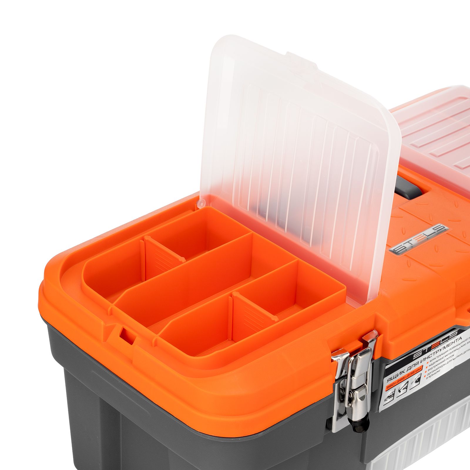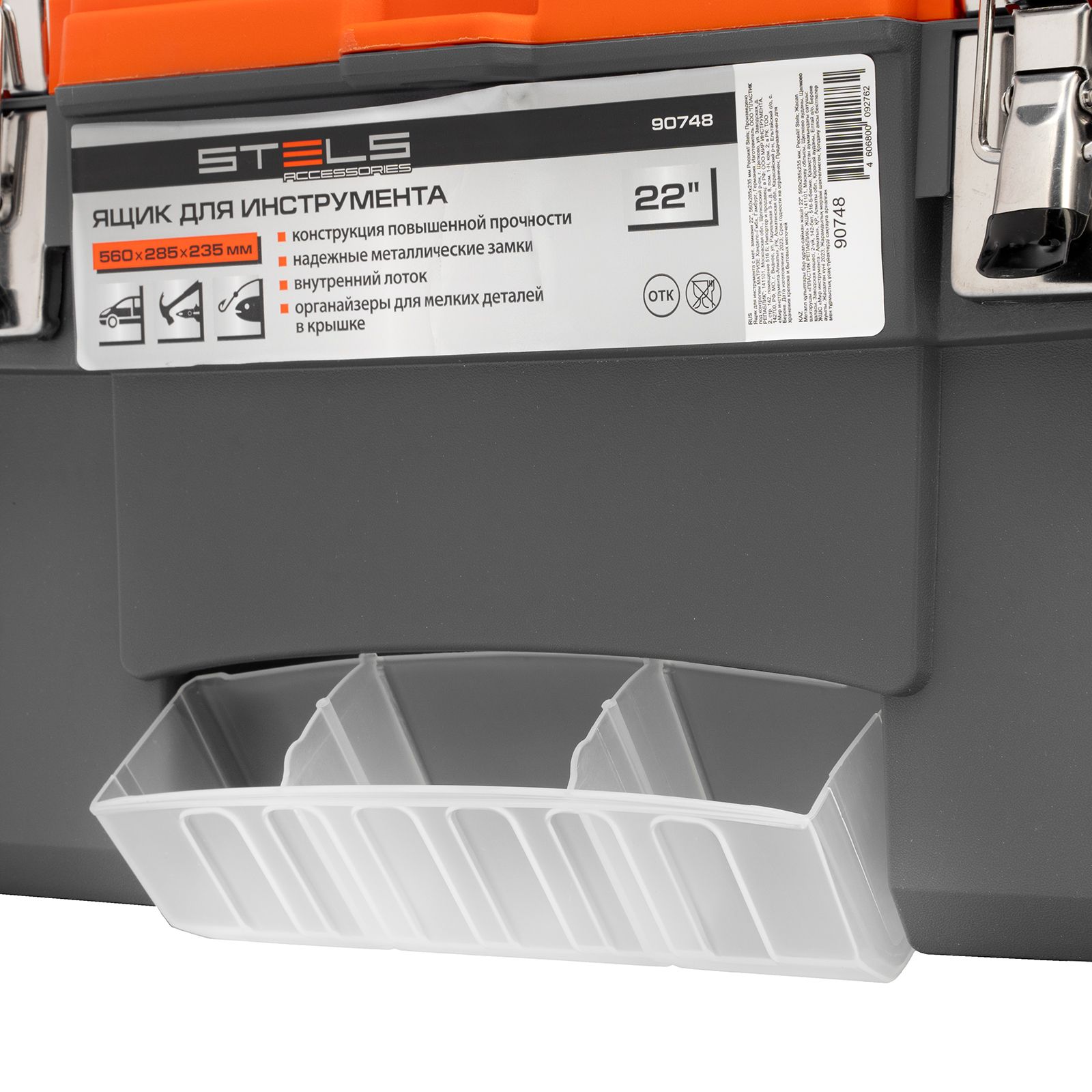 Ящик для инструмента Stels 90748 размером 22" (560 х 285 х 235 мм), с металлическими замками, — альтернатива коробке для инструментов. В нем можно расположить ручной инструмент, крепеж, хозяйственные мелочи, а также рыболовные снасти. В крышке имеются встроенные органайзеры, внутри ящика — выкидной лоток с отсеками для мелких деталей, что увеличивает функциональность изделия. Ящик удобно брать в поездки, также он пригодится дома, на даче или в гараже.